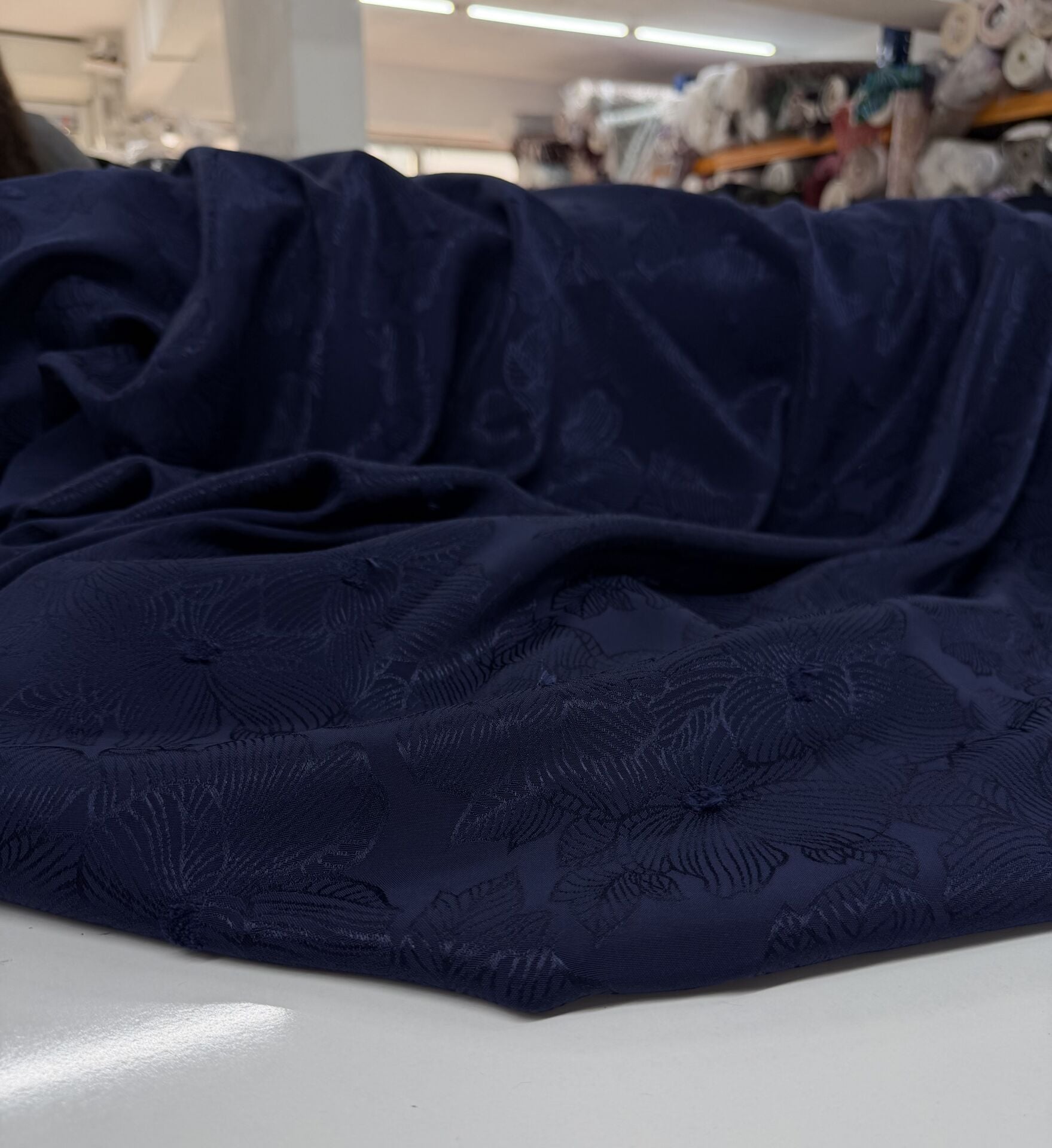 Yepyeni bir jakar floş deseni harika net lacivert tonuyla her giydiğinizde daha çok beğeneceksiniz.Elbiseler bu kumaşla bir sanat eserine dönüşürken sentetik içermeyen dokusu sizi terletmeyecek.